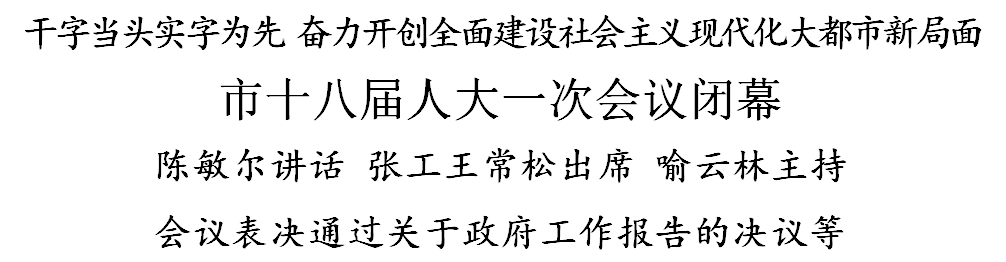 陈敏尔说,市十八届人大一次会议以习近平新时代中国特色社会主义思想为指导,全面贯彻党的二十大精神和党中央决策部署,认真落实市第十二次党代会和市委经济工作会议部署要求,充分发扬民主,集中各方智慧,顺利完成各项议程、取得圆满成功,必将激励全市广大干部群众在新征程上阔步前进。各位代表以高昂的政治热情和高度的主人翁责任感,依法履行职责、庄严行使权利,积极建言献策、共商发展大计,体现出强烈的政治担当、真挚的为民情怀、良好的精神风貌。